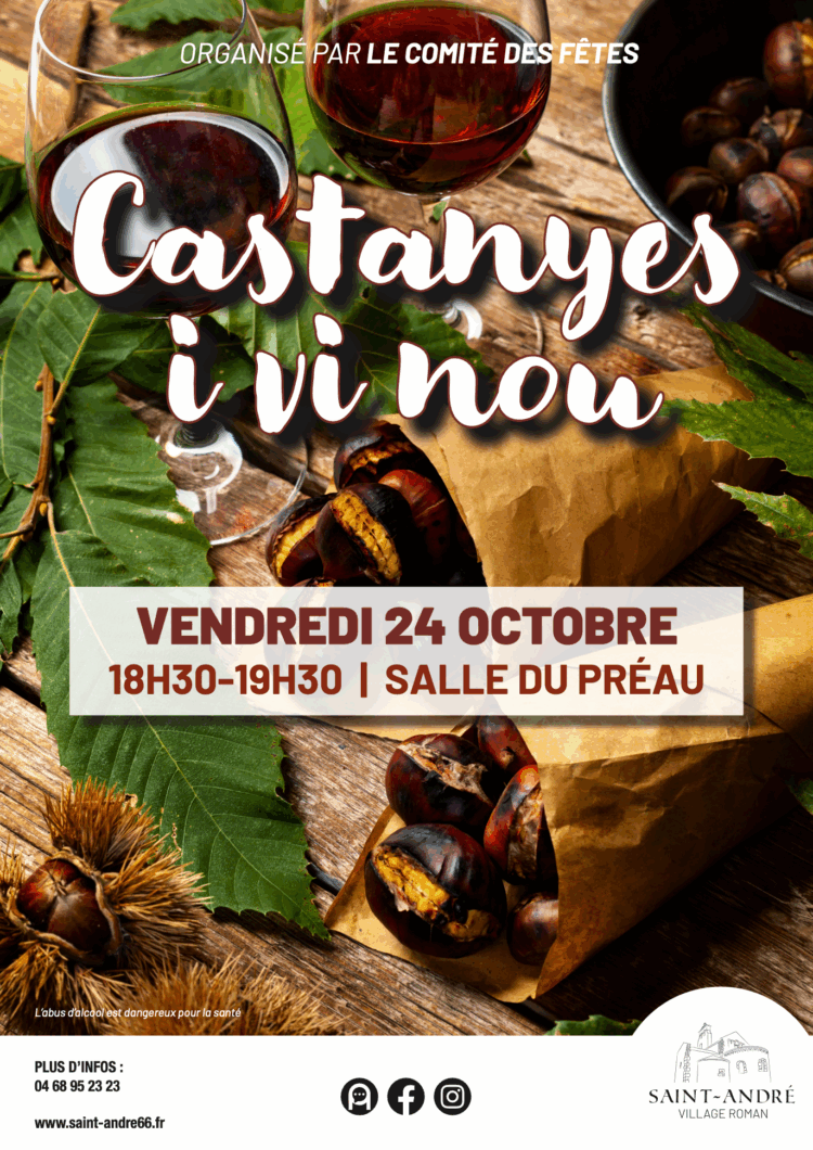 SOIRÉE CHÂTAIGNES & VIN NOUVEAULe Vendredi 24 octobre de 18H30 - 19H30 à la Salle du PréauAu programme : . Châtaignes grillées . Vin nouveau à découvrir